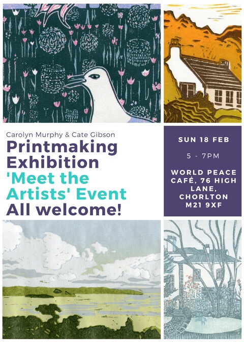 On Sunday 18 February you are invited along to Chorlton’s Printmaking Exhibition at the World Peace Café from 5-7pm. Carolyn Murphy and Cate Gibson’s work is on show at the café until 28 February and this is a chance to meet the artists, see a wide range of their work and join them for refreshments and a chat.